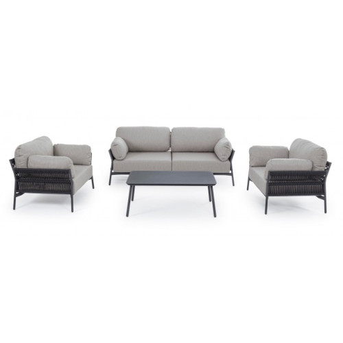 АЛЮМИНИЕВАЯ РАМА С ПОРОШКОВЫМ ПОКРЫТИЕМ (ПОЛИЭСТЕР). ВЕРЕВОЧНОЕ ПЛОТЕНИЕ ИЗ ОЛЕФИНОВОЙ ТКАНИ (100% ПОЛИПРОПИЛЕНА). ПОДУШКИ СИДЕНЬЯ И СПИНКИ СО СЪЕМНЫМ ПОКРЫТИЕМ ИЗ ВОДООТталкивающей ОЛЕФИНОВОЙ ТКАНИ (100% ПОЛИПРОПИЛЕНА).