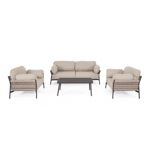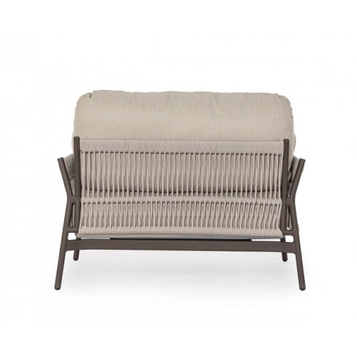 АЛЮМИНИЕВАЯ РАМА С ПОРОШКОВЫМ ПОКРЫТИЕМ (ПОЛИЭСТЕР). ВЕРЕВОЧНОЕ ПЛОТЕНИЕ ИЗ ОЛЕФИНОВОЙ ТКАНИ (100% ПОЛИПРОПИЛЕНА). ПОДУШКИ СИДЕНЬЯ И СПИНКИ СО СЪЕМНЫМ ПОКРЫТИЕМ ИЗ ВОДООТТАЛКИВАЮЩЕЙ ОЛЕФИНОВОЙ ТКАНИ (100% ПОЛИПРОПИЛЕНА).