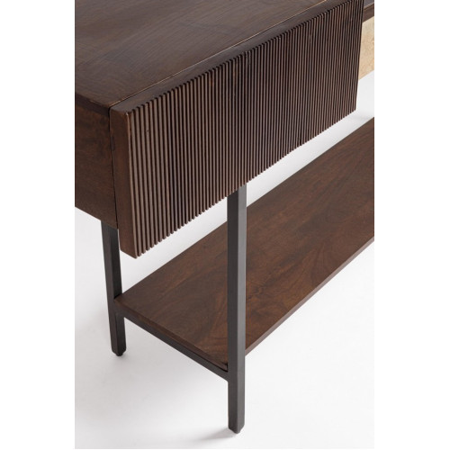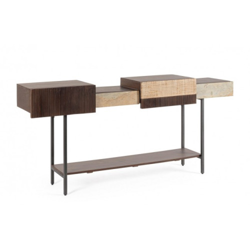 КАРКАС ИЗ ДЕРЕВА МАНГО, ЗАДНЯЯ ЧАСТЬ И КОНСТРУКЦИЯ ЯЩИКА МДФ, ПЕРЕДНЯЯ ЧАСТЬ ЯЩИКОВ: ДВА ОБЛИЦОВКИ НАТУРАЛЬНОГО КАМНЯ, ОДНА ДЕРЕВО, ОДИН С Аппликациями из ротанга. ЛАКОВАЯ ОТДЕЛКА НА ВОДНОЙ ОСНОВЕ. НОЖКИ ИЗ СТАЛИ С ЭПОКСИДНО-ПОРОШКОВЫМ ПОКРЫТИЕМ. НОГИ В СБОРЕ.