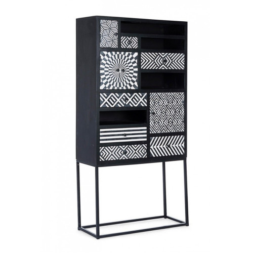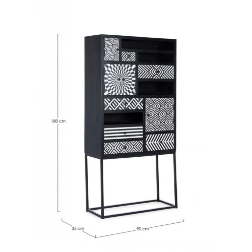 КАРКАС ДЕРЕВА МАНГО. СПИНКА, ДВЕРИ И ЯЩИКИ ИЗ МДФ. ПЕРЕДНЯЯ ЧАСТЬ ДВЕРЕЙ И ЯЩИКОВ С МОЗАИЧНОЙ ОБРАБОТКОЙ С ПОМОЩЬЮ МАЛЕНЬКИХ ПЛИТОК ИЗ СМОЛЫ. НИТРОЦЕЛЛЮЛОЗНАЯ ОТДЕЛКА. СТАЛЬНЫЕ НОЖКИ С ЭПОКСИДНО-ПОРОШКОВЫМ ПОКРЫТИЕМ. СТАЛЬНЫЕ РУЧКИ.