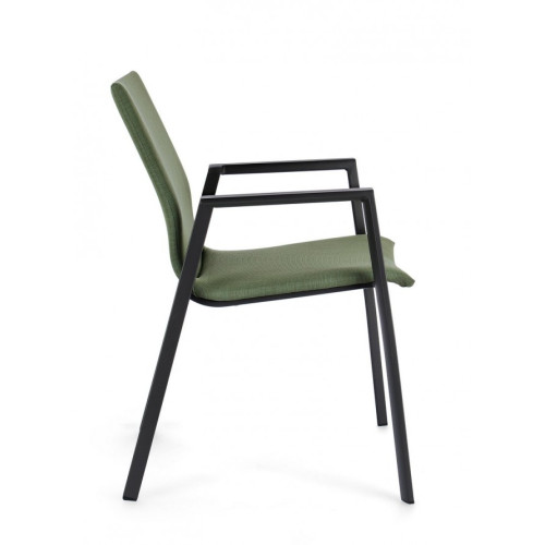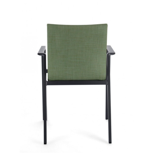 АЛЮМИНИЕВАЯ РАМА С ПОРОШКОВЫМ ПОКРЫТИЕМ (ПОЛИЭСТЕР). СМЕШАННАЯ ТКАНЬ (70% ТЕКСТИЛЕН И 30% ОЛЕФИНА) ВОДООТТАЛКИВАЮЩЕЕ ПОКРЫТИЕ СИДЕНЬЯ И СПИНКИ. НАКЛАДКА ДЛЯ НАРУЖНОГО ИСПОЛЬЗОВАНИЯ БЫСТРОСУХАЯ ПЕНА. ШТАБИРУЕМЫЙ.