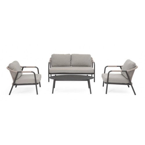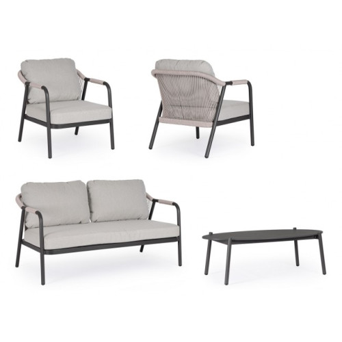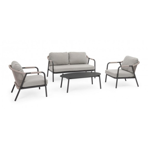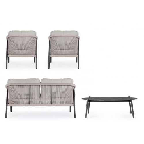 СТРУКТУРА ИЗ АЛЮМИНИЯ С ПОРОШКОВЫМ ПОКРЫТИЕМ (ПОЛИЭСТЕР). ПЛЕТЕНИЕ ДЛЯ НАРУЖНОГО ИСПОЛЬЗОВАНИЯ ИЗ ПОЛИЭСТЕРНОЙ ВЕРЕВКИ. ВЕРХНЯЯ ВЕРХНЯЯ КАМНЯ (НАТУРАЛЬНЫЙ КАМЕНЬ, ОБРАБОТАННЫЙ ПРИ ВЫСОКИХ ТЕМПЕРАТУРАХ) (ТОЛЩИНА 11ММ). СЪЕМНЫЕ ПОДУШКИ ИЗ 100% ПОЛИЭСТЕРНОЙ ВОДООТТАЛКИВАЮЩЕЙ ТКАНИ. ВИНТЫ ИЗ НЕРЖАВЕЮЩЕЙ СТАЛИ. ЖУРНАЛЬНЫЙ СТОЛИК В СБОРЕ.
