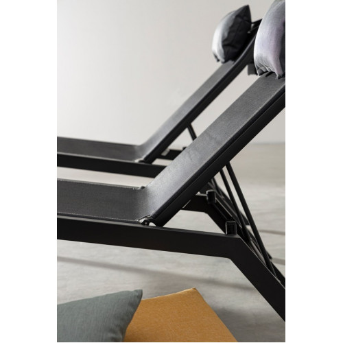 АЛЮМИНИЕВАЯ РАМА С ПОРОШКОВЫМ ПОКРЫТИЕМ (ПОЛИЭСТЕР). ТЕКСТИЛЕН 1Х1. ТРИ ПОЛОЖЕНИЯ ОТКЛОНЕНИЯ СПИНКИ. СЪЕМНАЯ ПОДУШКА ПОДГОЛОВНИКА СО СЪЕМНЫМ ПОКРЫТИЕМ И НАПОЛНИТЕЛЕМ ДЛЯ ВНЕШНЕГО ИСПОЛЬЗОВАНИЯ БЫСТРО СУХАЯ ПЕНА. ВИНТЫ ИЗ НЕРЖАВЕЮЩЕЙ СТАЛИ. ПОДЛЕЖИТ СБОРКЕ.